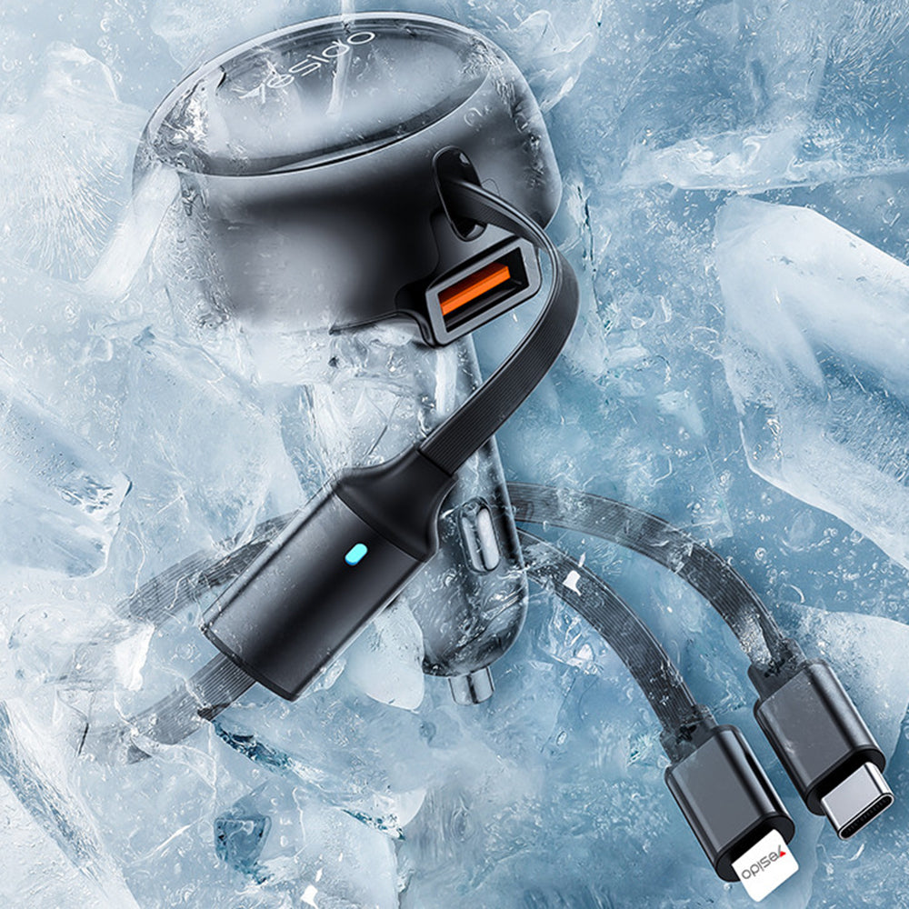 A car charger with fast charging and retractable design, designed for consistent performance, high safety, and impeccable organization. Constant power and high efficiency The charger provides stable, fast, and safe power for multiple devices simultaneously, maintaining the optimal charging speed for each active port. Telescopic design and practical use The retractable cable easily adjusts to the desired length and automatically returns to its original position, contributing to an organized space. Specifications: Materials: Flame retardant ABS, polycarbonate; Port interface: UBS-A; Input current: DC 12-24V; USB power: QC18W Max; Type-C cable power: PD35W Max; Lightning cable power: 27W Max; Power Type-C cable + USB-A: 35W + 18W; Power Lightning cable + USB-A: 27W + 18W; Power Type-C cable + Lightning cable: Max 15W; Total power: 53W Max; Cable length: 73cm; Dimensions: 8.6 x 5.0cm; Weight: approx. 69g.