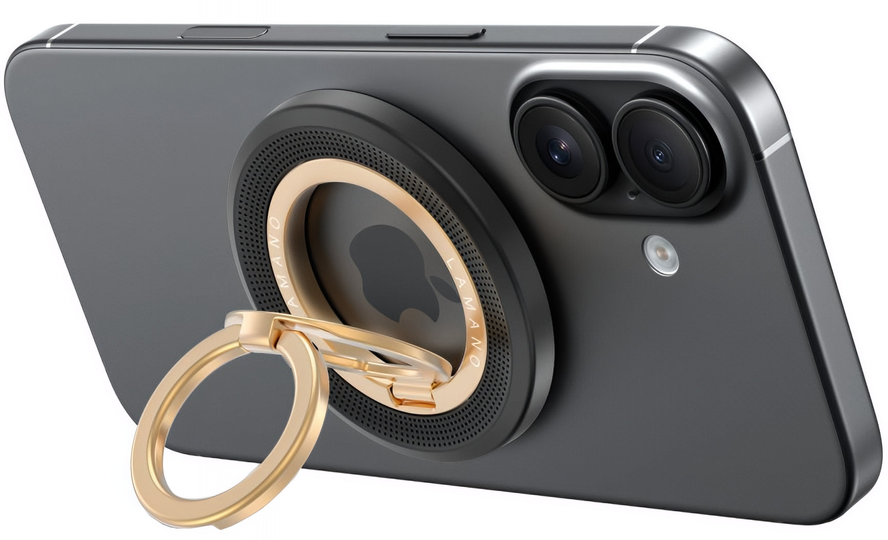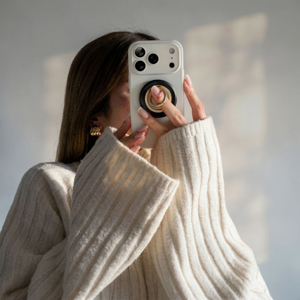 The ring can freely tilt, allowing stable support on flat surfaces or comfortable hand use, both in portrait and landscape orientations.