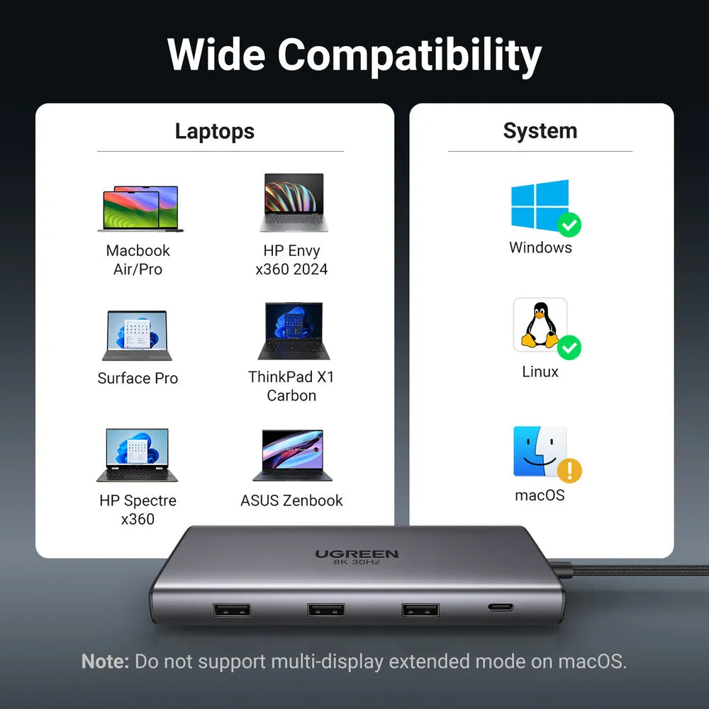 UGREEN Revodok Pro 210 CM639 USB-C Hub, 1 x USB-A 3.0 - 2 x USB-A - 2 x USB-C - 2 x HDMI - 1 x RJ45 - 1 x SD - 1 x microSD, Gray