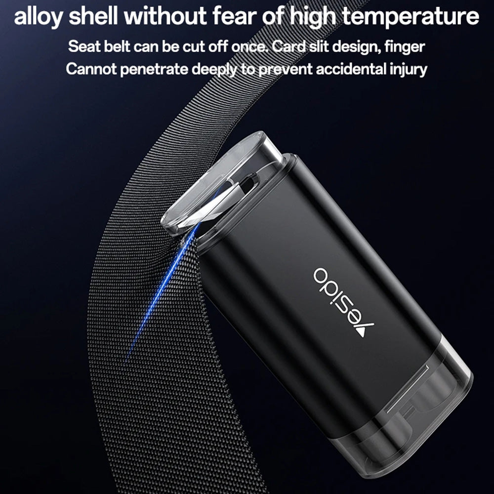 the stainless steel blade cuts safety belts, and the integrated magnet allows for visible and easy mounting in the car.