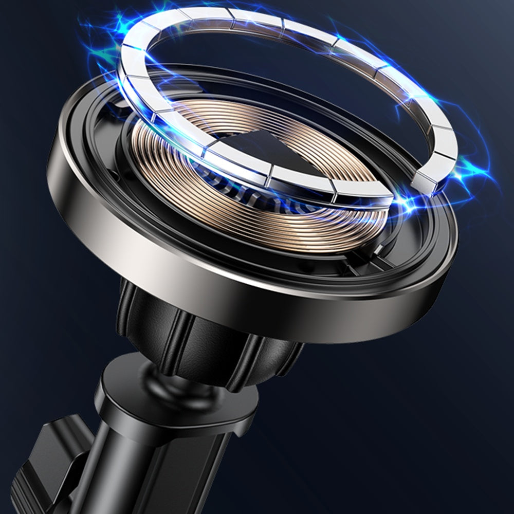 Car holder with stable grip, full 360 rotation and detachable magnetic panel that can also be used as a wireless desk charger.