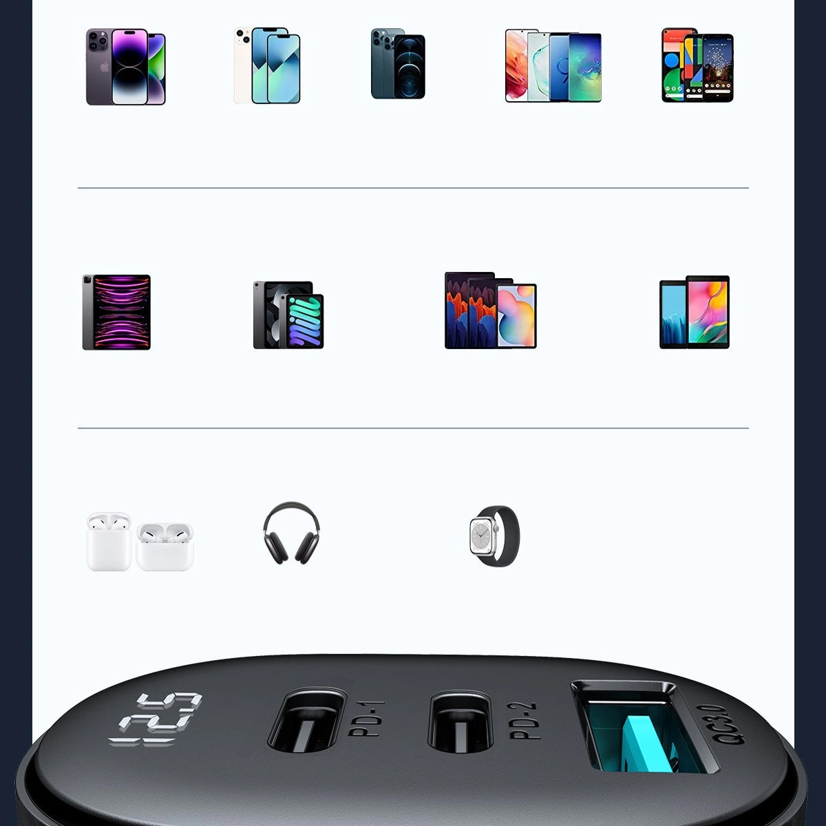 позволява едновременно зареждане на три устройства. Вграденият цифров дисплей наблюдава напрежението в реално време, гарантирайки безопасност и ефективност.