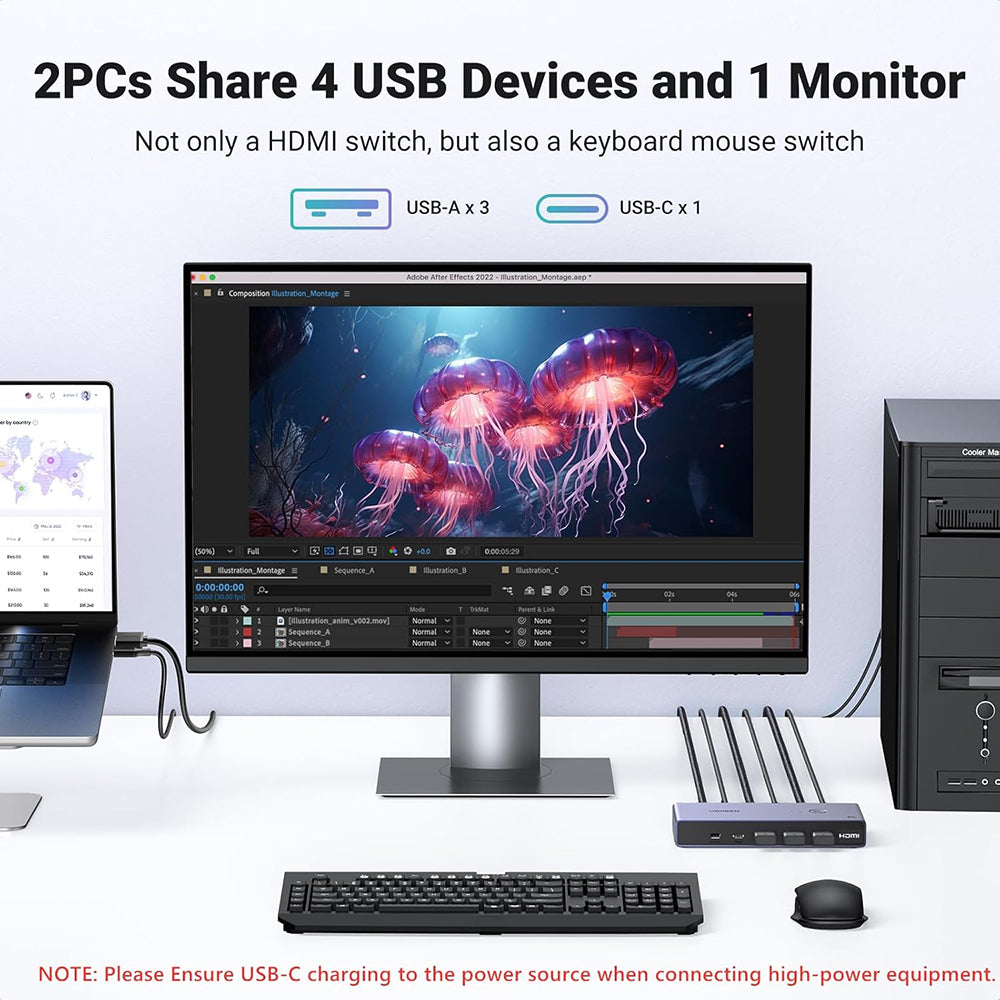 UGREEN CM692 е превключвател, който ви позволява да контролирате два компютъра, използвайки един монитор и четири USB 3.0 устройства, като клавиатура,
